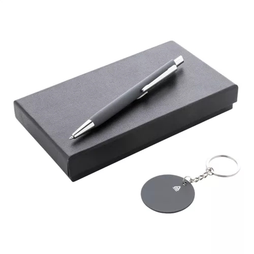 2 részes ajándékkészlet fekete papír díszdobozban. Tartalmazz egy újrahasznosított alumínium golyóstollat ​​gumírozott bevonattal és kék tollbetéttel, valamint egy újrahasznosított rozsdamentes acél kulcstartót gumírozott felülettel. Mindkét elem speciális bevonattal rendelkezik a tükörgravírozáshoz.