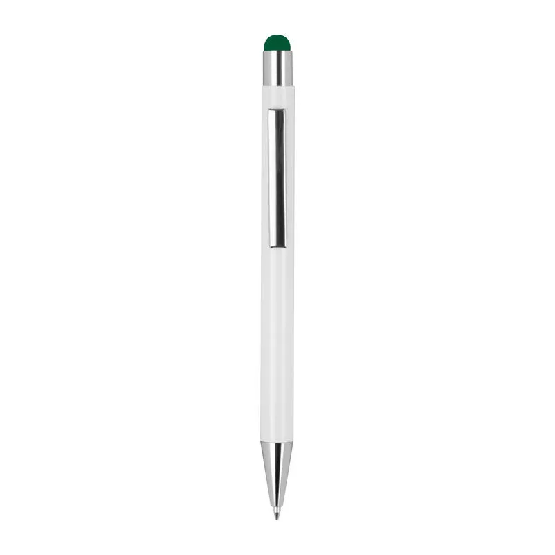Alumínium golyóstoll ezüst színű kiegészítőkkel, érintő funkcióval és kék színű tollbetéttel.