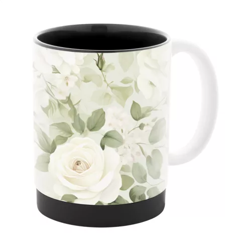 Szublimációs kerámia bögre színes belsővel, alján hozzáillő színű szilikon gyűrűvel, 300 ml. Fehér papírdobozban.