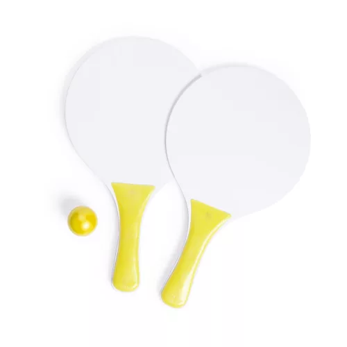 Fából készült strandjáték szett, 2 db ütőt és egy labdát tartalmaz.