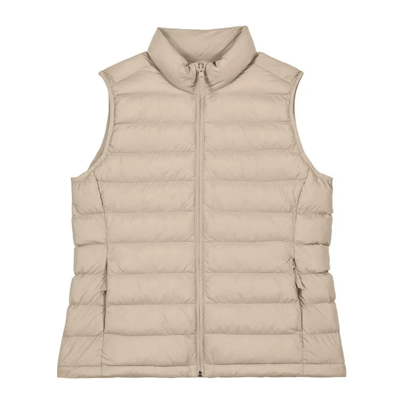 Ujjatlan kialakítás. Magas gallér. Fordított nejlon cipzár elöl, középen. Cipzáras zsebek díszszalaggal ellátott húzóval. Rugalmas szegőszalag a karkivágásnál. Teljesen steppelt kivitel. Oldalpanelek a jobb illeszkedésért. A belső varratok szegéllyel eldolgozva. Az alsó szegély állítható műanyag záróval és rugalmas zsinórral.
