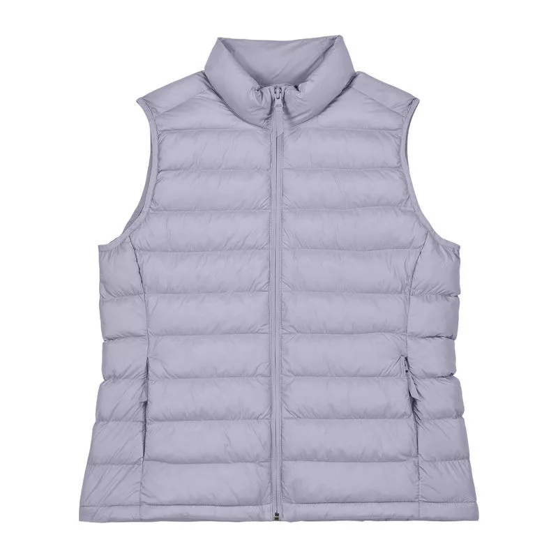 Ujjatlan kialakítás. Magas gallér. Fordított nejlon cipzár elöl, középen. Cipzáras zsebek díszszalaggal ellátott húzóval. Rugalmas szegőszalag a karkivágásnál. Teljesen steppelt kivitel. Oldalpanelek a jobb illeszkedésért. A belső varratok szegéllyel eldolgozva. Az alsó szegély állítható műanyag záróval és rugalmas zsinórral.