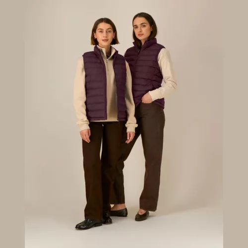 Ujjatlan kialakítás. Magas gallér. Fordított nejlon cipzár elöl, középen. Cipzáras zsebek díszszalaggal ellátott húzóval. Rugalmas szegőszalag a karkivágásnál. Teljesen steppelt kivitel. Oldalpanelek a jobb illeszkedésért. A belső varratok szegéllyel eldolgozva. Az alsó szegély állítható műanyag záróval és rugalmas zsinórral.