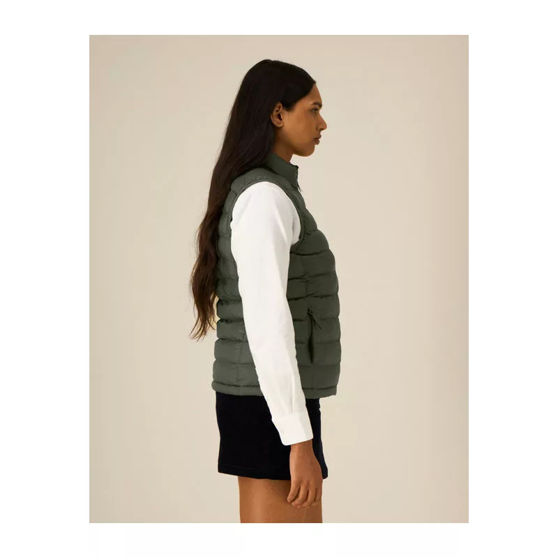Ujjatlan kialakítás. Magas gallér. Fordított nejlon cipzár elöl, középen. Cipzáras zsebek díszszalaggal ellátott húzóval. Rugalmas szegőszalag a karkivágásnál. Teljesen steppelt kivitel. Oldalpanelek a jobb illeszkedésért. A belső varratok szegéllyel eldolgozva. Az alsó szegély állítható műanyag záróval és rugalmas zsinórral.