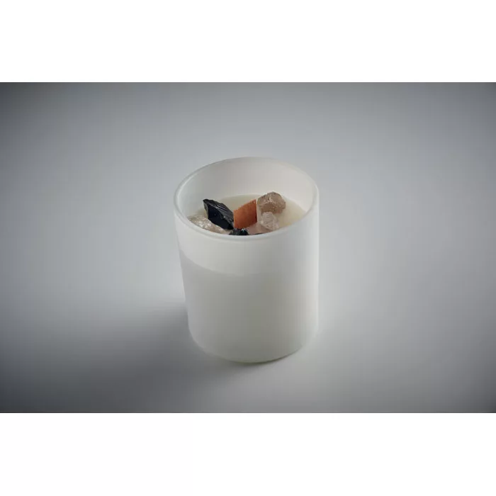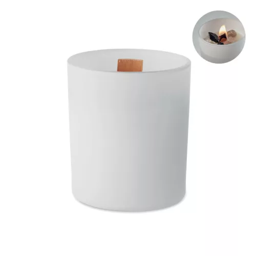 Vanília illatú növényi alapú viaszgyertya üvegben, kövekkel és fa kanóccal. 200 g. Égési idő: 20 óra.