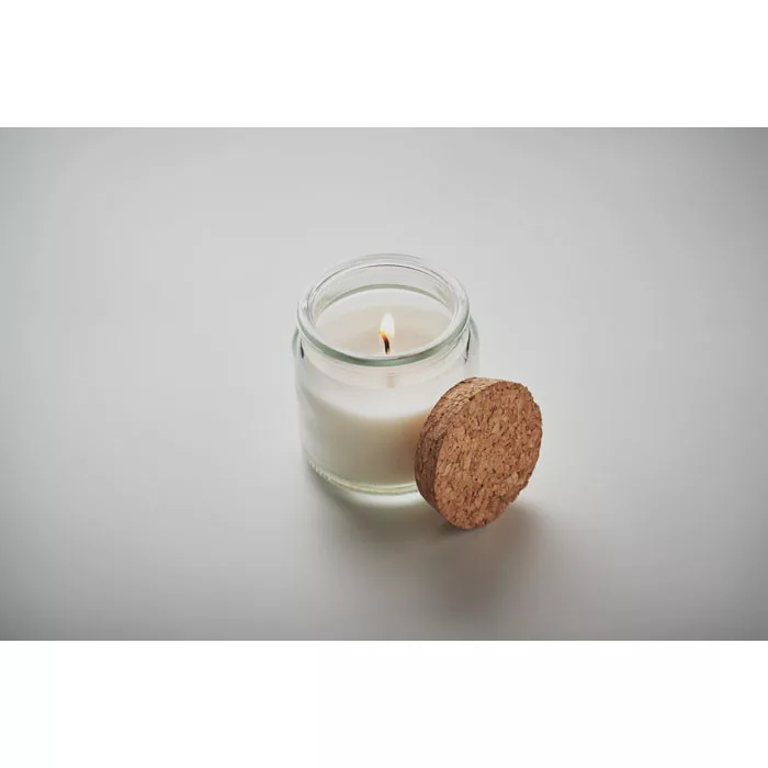 Vanília illatú, növényi alapú viaszgyertya üveg tartóban, parafa fedővel. 70 g. Égési idő 12 óra.
