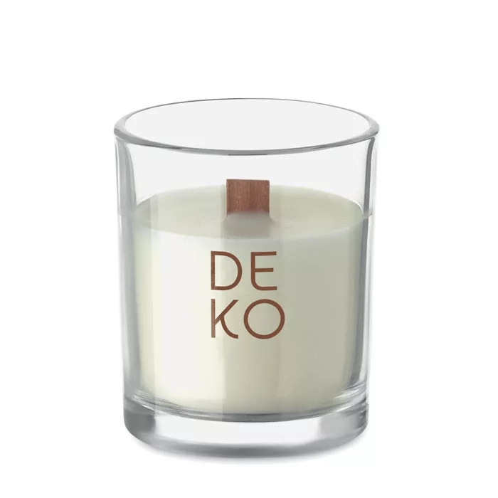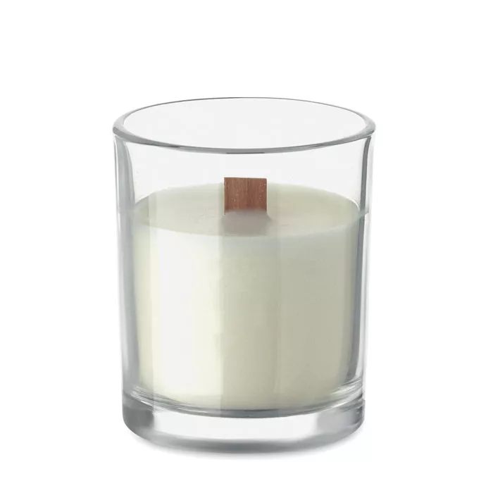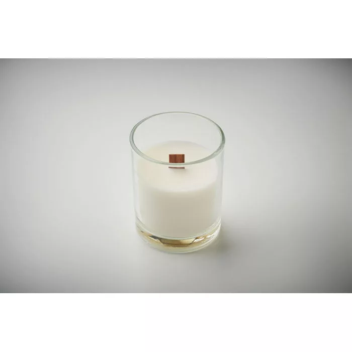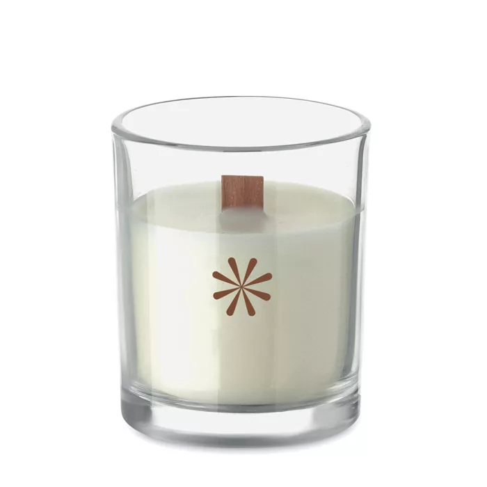 Vanília illatú, növényi alapú viaszgyertya üveg tartóban, fa kanóccal. 80 g. Égési idő 14 óra.