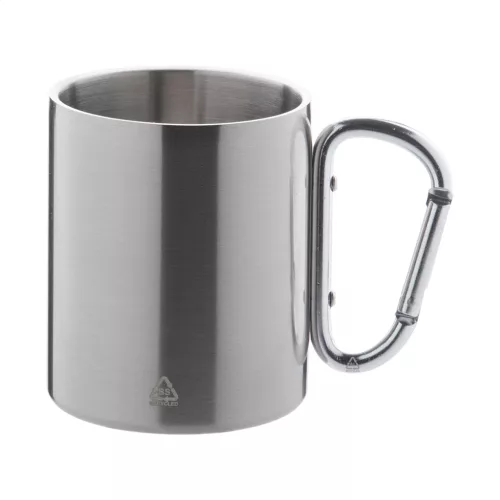 Duplafalú, újrahasznosított rozsdamentes acél thermo bögre, megegyező színű újrahasznosított alumínium karabineres fogantyúval. 300 ml. Kraft papír dobozban szállítjuk.