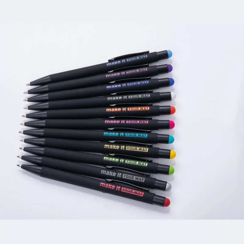 Fém golyóstoll fekete színű gumírozott tolltesttel, kék színű betéttel és érintőképernyős funkcióval ellátva. A gumírozott réteg alatti színes bevonat biztosítja, hogy a logó színe megegyezik a hegy színével gravírozás után.