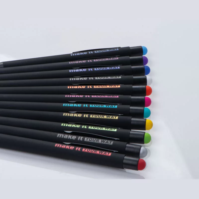 Fém golyóstoll fekete színű gumírozott tolltesttel, kék színű betéttel és érintőképernyős funkcióval ellátva. A gumírozott réteg alatti színes bevonat biztosítja, hogy a logó színe megegyezik a hegy színével gravírozás után.