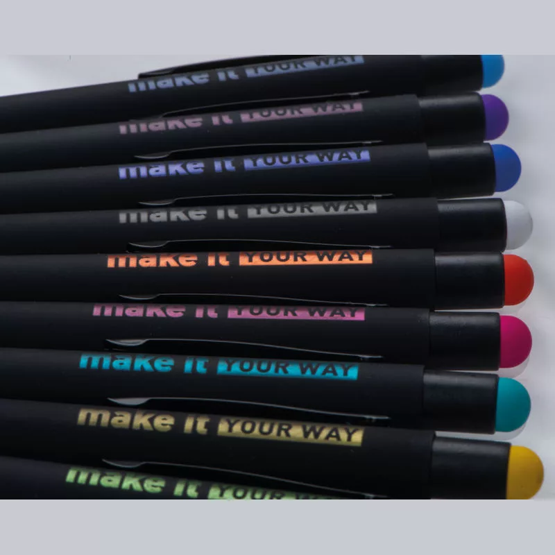 Fém golyóstoll fekete színű gumírozott tolltesttel, kék színű betéttel és érintőképernyős funkcióval ellátva. A gumírozott réteg alatti színes bevonat biztosítja, hogy a logó színe megegyezik a hegy színével gravírozás után.