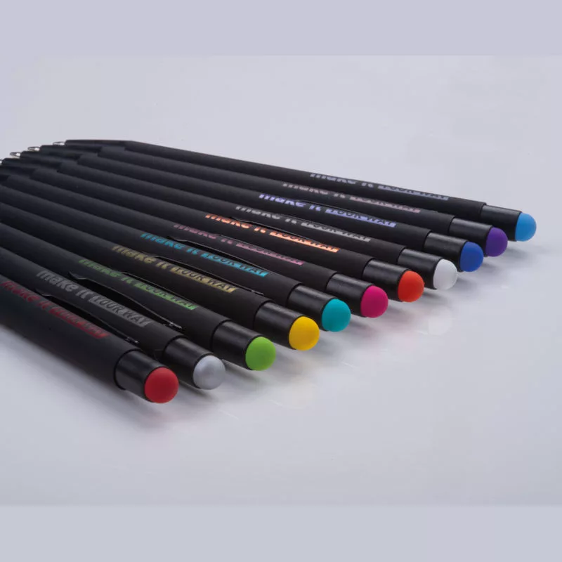Fém golyóstoll fekete színű gumírozott tolltesttel, kék színű betéttel és érintőképernyős funkcióval ellátva. A gumírozott réteg alatti színes bevonat biztosítja, hogy a logó színe megegyezik a hegy színével gravírozás után.