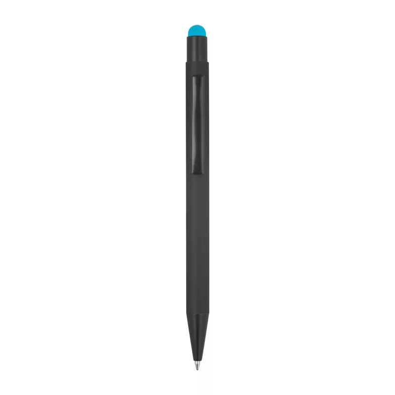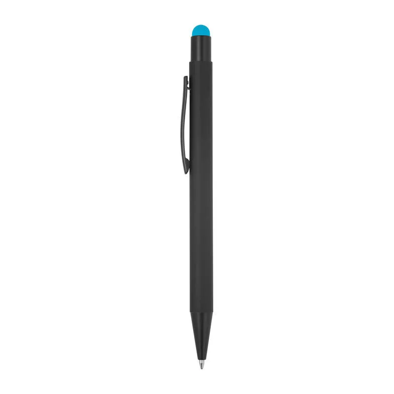 Fém golyóstoll fekete színű gumírozott tolltesttel, kék színű betéttel és érintőképernyős funkcióval ellátva. A gumírozott réteg alatti színes bevonat biztosítja, hogy a logó színe megegyezik a hegy színével gravírozás után.