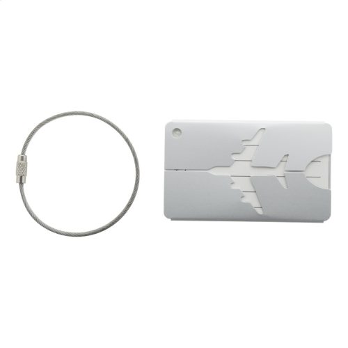 Alumínium bőröndcímke repülőgép motívummal és fém zsinórral.
