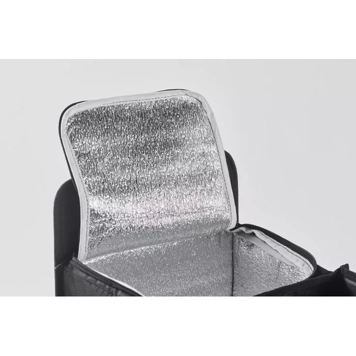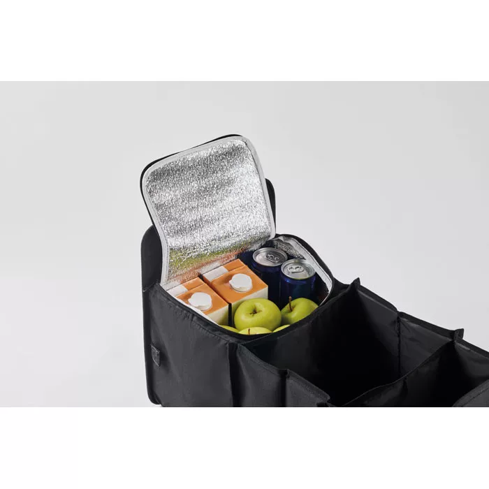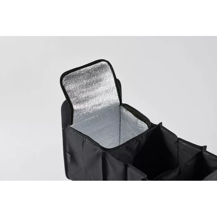 Összehajtható autós rendszerező 600D RPET poliészterből, 3 rekesszel, melyek közül az egyik hűtőtáska rekesz.
