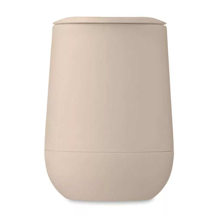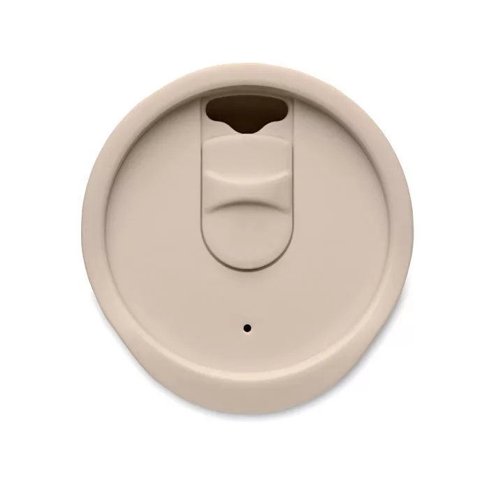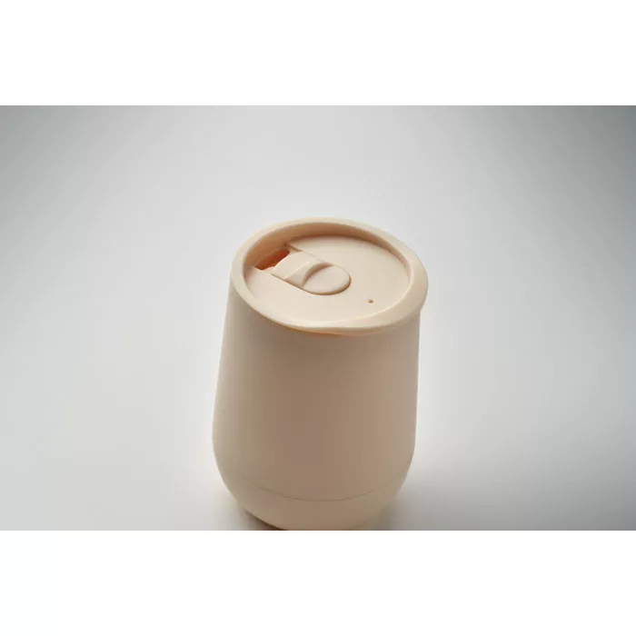 Duplafalú pohár PP-ből, csúsztatható ivónyílással ellátott, PS és ABS anyagból készült fedéllel. Űrtartalom: 300 ml.