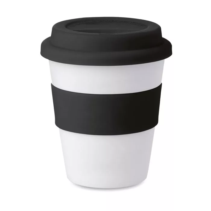 Szimplafalú pohár fényes fehér PP anyagból. Szilikon tető és markolat. Űrtartalom: 350 ml. Mivel ez egy szimplafalú bögre, hőátadás lehetséges.