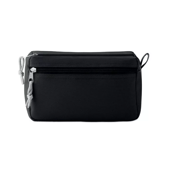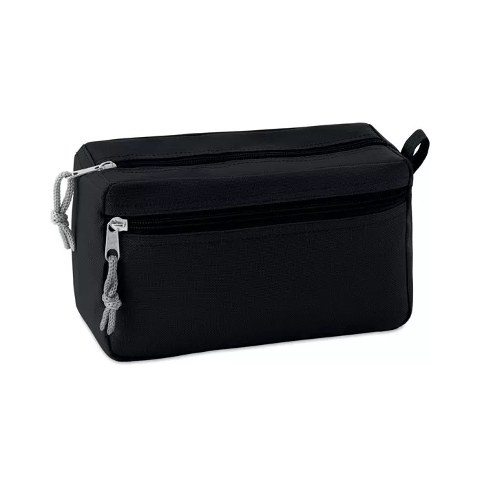 600D poliészter kozmetikai táska az oldalán cipzáras zsebbel. TPE belső borítással.