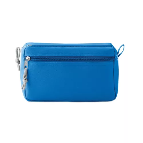 600D poliészter kozmetikai táska az oldalán cipzáras zsebbel. TPE belső borítással.