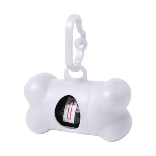 Csont alakú műanyag tartó, 15 db kutyapiszok gyűjtő zacskóval és karabinerrel.