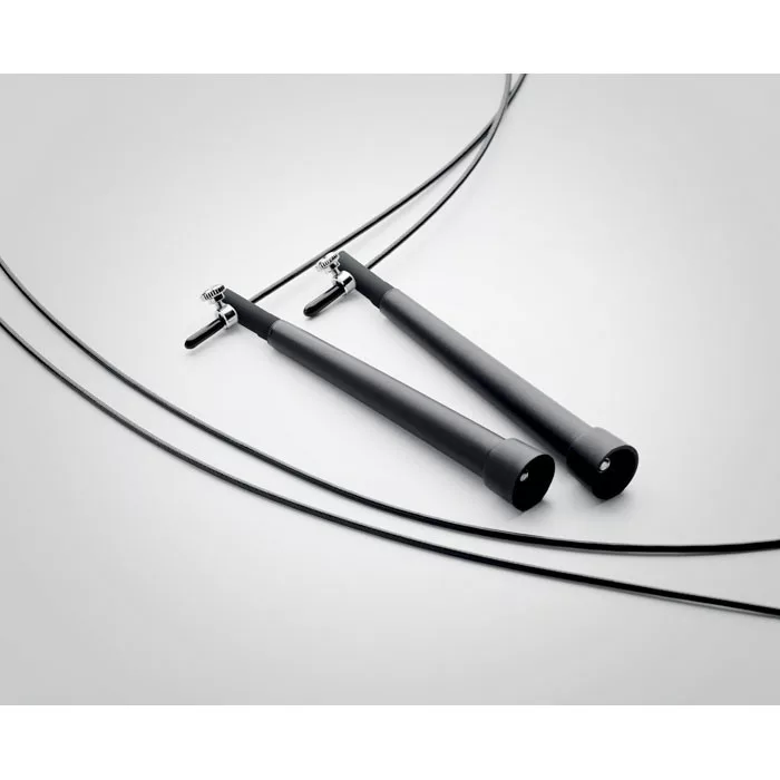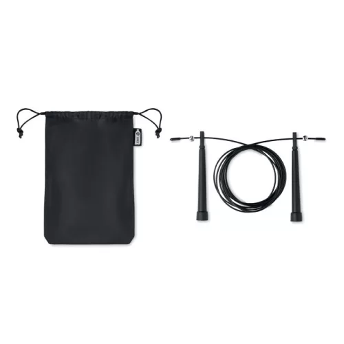 Állítható hosszúságú gyorsasági ugrókötél 210D RPET tokban. A hosszúság növelését vagy csökkentését a fogantyú melletti csavarokkal teheti meg. Az ugrókötelezés kitűnő módszer az egész test edzésére. A tárolótasak segítségével könnyedén magával viheti a kötelet az edzőterembe vagy bárhová, ahol gyakorolni szeretne.