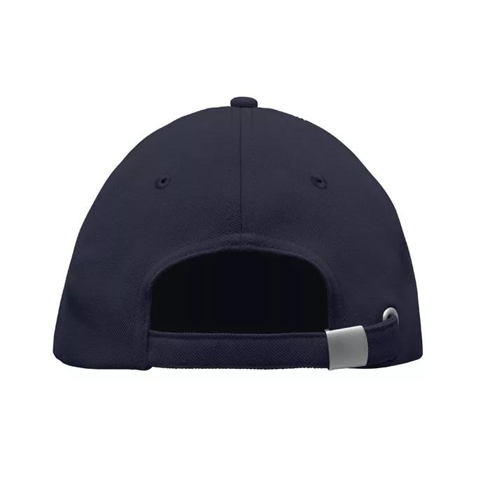 5 paneles baseball sapka 210 g/m² RPET poliészterből, ezüst színű acél csattal. 4 hímzett, színazonos szellőzőlyukkal. Méret 7 1/4.