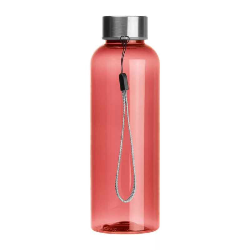 500 ml-es újrahasznosított PET-ből készült, BPA mentes kulacs, rozsdamentes kupakkal, csuklópánttal.