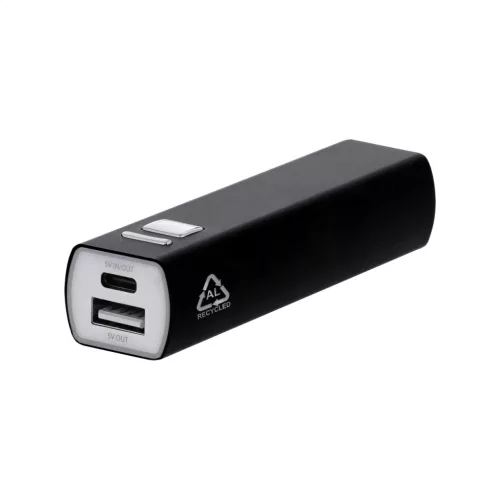 Újrahasznosított alumínium power bank 2600 mAh akkumulátorral. 1 USB és 1 USB-C töltőporttal. USB-C bemeneti porttal. USB töltőkábellel szállítjuk.