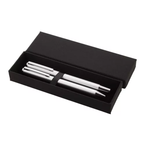 Újrahasznosított alumínium toll szett, golyóstollal és roller tollal. Fekete ajándékdobozban, kék tollbetéttel szállítjuk.