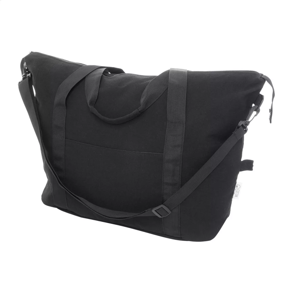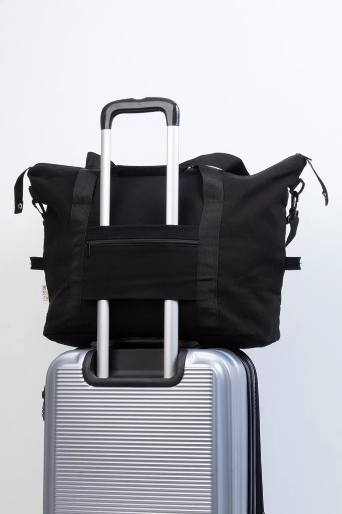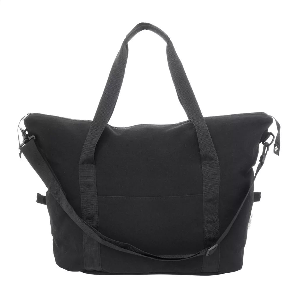 Újrahasznosított vászon utazó- és sporttáska cipzáras fő rekesszel, elülső zsebbel, állítható vállpánttal és cipzáras hátsó zsebbel, amely bőröndpántként is funkcionál. 70% újrahasznosított pamut és 30% RPET poliészter. Megkülönböztető újrahasznosított pamut címkével.