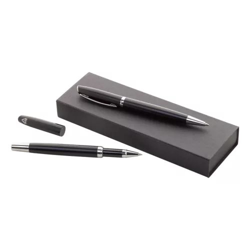 Újrahasznosított alumínium toll szett, golyóstollal és roller tollal. Fekete ajándékdobozban, kék tollbetéttel szállítjuk.