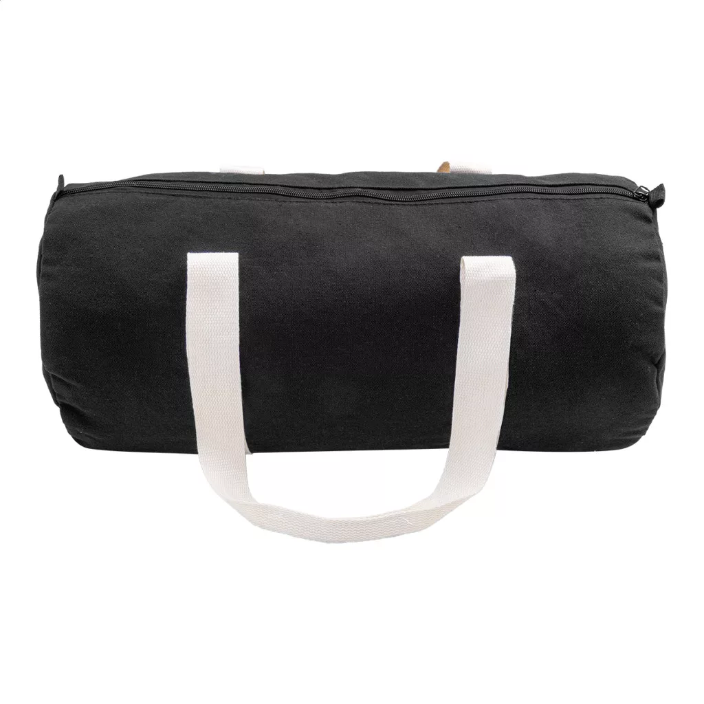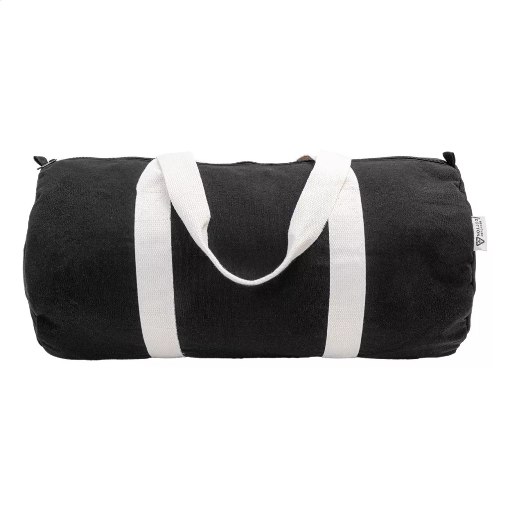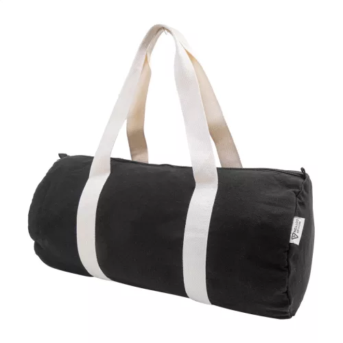Újrahasznosított vászon sporttáska cipzáras fő rekesszel, cipzáras belső zsebbel és hosszú fogantyúkkal. 70% újrahasznosított pamut és 30% újrahasznosított poliészter. Megkülönböztető újrahasznosított pamut címkével.