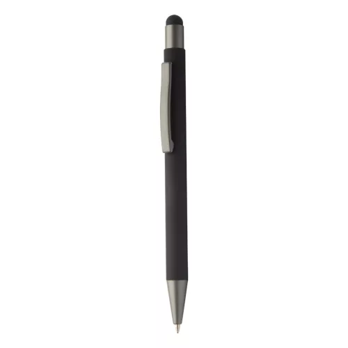Újrahasznosított alumínium és érintőképernyős golyóstoll gumírozott testtel és fegyverfém részekkel. Kék tollbetéttel.