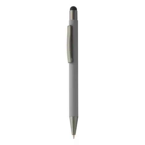Újrahasznosított alumínium és érintőképernyős golyóstoll gumírozott testtel és fegyverfém részekkel. Kék tollbetéttel.