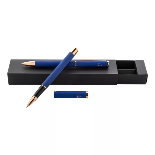 Újrahasznosított alumínium tollszett golyóstollal és rollertollal, gumírozott felülettel és rózsaarany részletekkel. Kék tollbetéttel. Speciális bevonattal a tükörlézeres gravírozáshoz rózsaarany színben. Fekete papír ajándékdobozban.