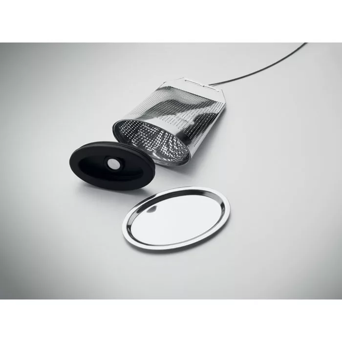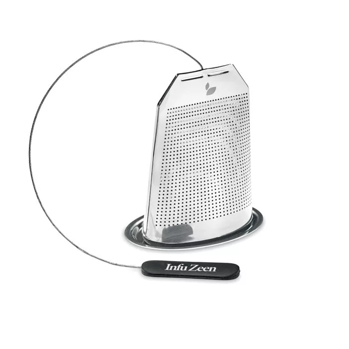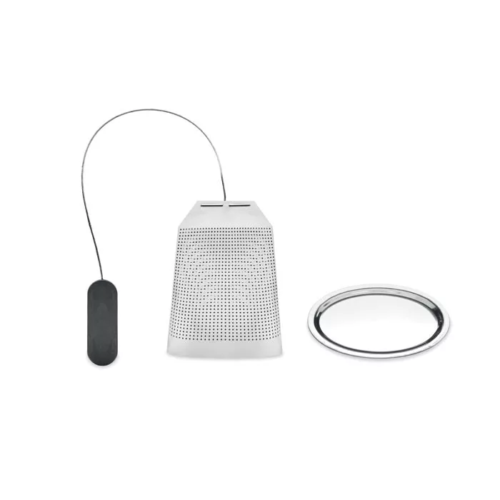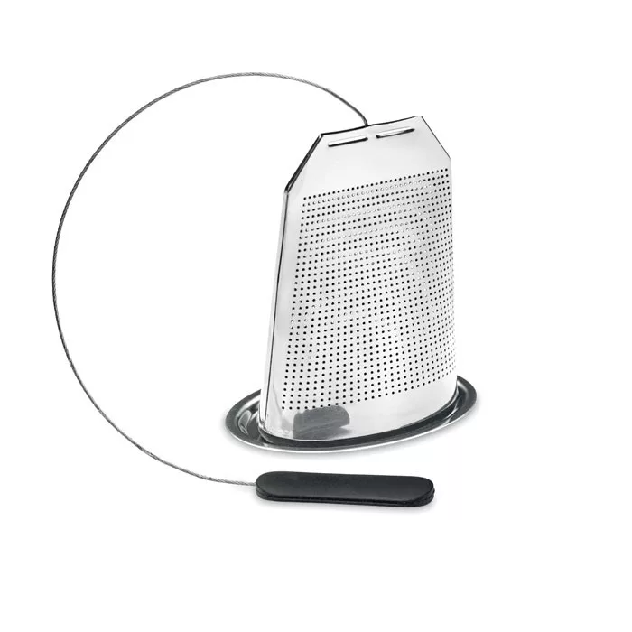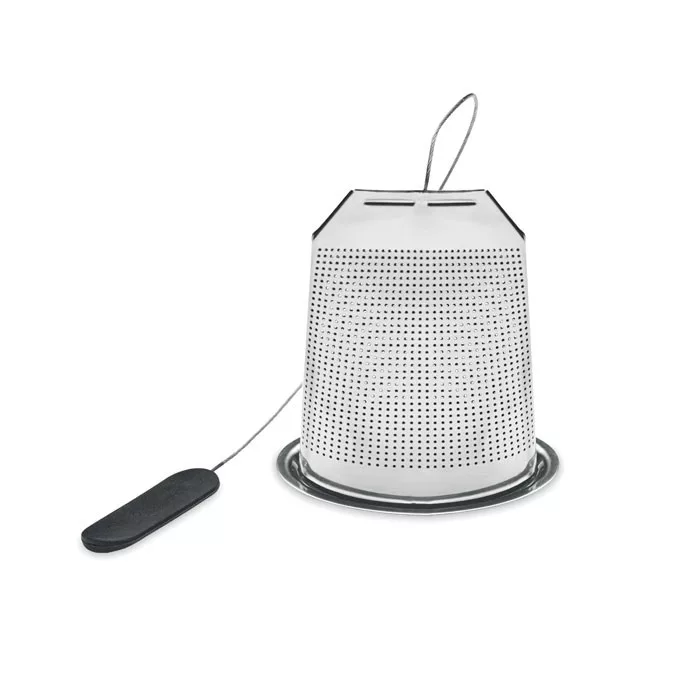 Rozsdamentes acélból készült, teafilter formájú teatojás, alátéttel, szilikon fogantyúval.