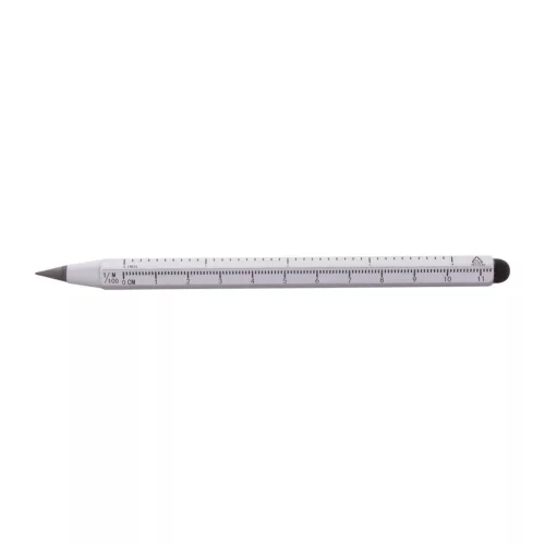 Újrahasznosított alumíniumból készült, hosszantartó tintamentes toll érintőképernyős gombbal és fémötvözet heggyel, amely oxidálja a papírt. Hatszögletű markolattal, 11 cm-es és 4 hüvelykes vonalzóval. Ez a toll egy ceruzához hasonlóan ír és radírozható.