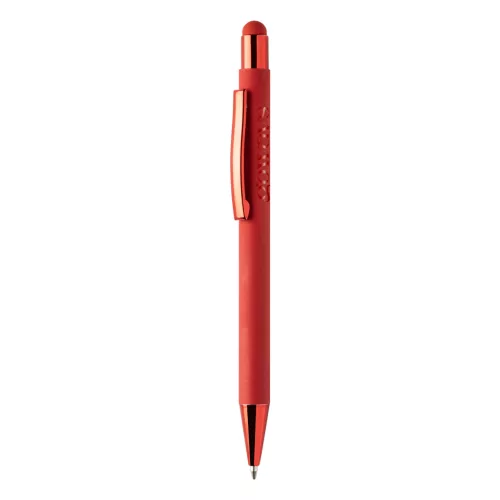 Újrahasznosított alumínium és érintőképernyős golyóstoll gumírozott testtel és színes fényes fémes részekkel. Speciális bevonattal a fémes részekhez illeszkedő tükörgravírozáshoz. Kék tollbetéttel.