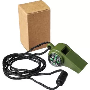 Síp (90 dB) iránytűvel és hőmérővel. A hőmérő Celsius-fokban mutatja a hőmérsékletet. Tartalmaz egy 100 cm-es poliészter nyakpántot ABS biztonsági csattal. Egyenként barna kartondobozba csomagolva. Anyaga: PP.