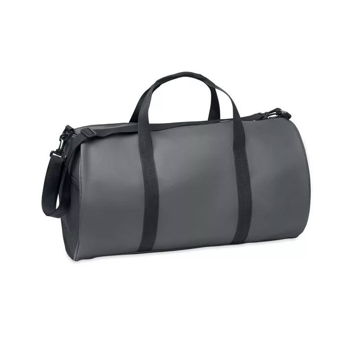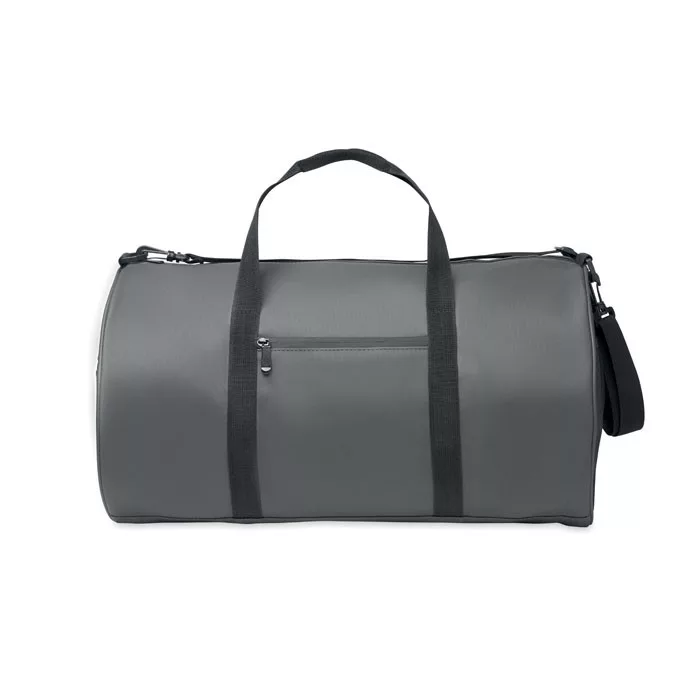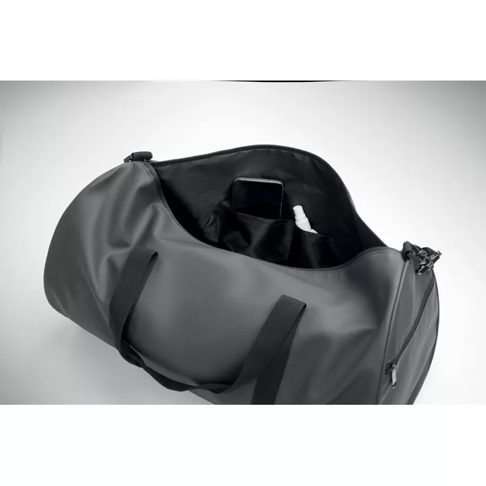 Sport- vagy utazótáska 600D RPET poliészterből, PU bevonattal. Cipzáras első zseb. 210D RPET poliészter bélés. 1 cipzáras és 1 hálós oldalsó rekesz. Belső cipzáras zseb.