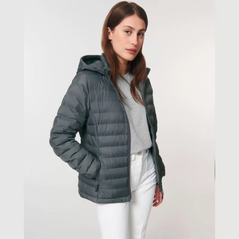 Elegáns steppelt dzseki magas gallérral, levehető kapucnival, állítható szegéllyel és letisztult cipzáras zsebekkel. Karcsúsított.