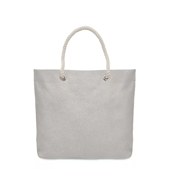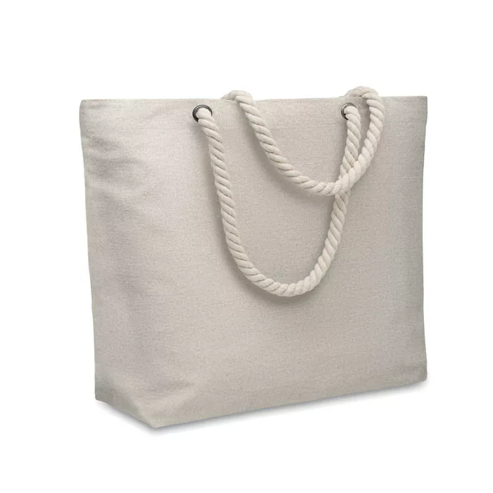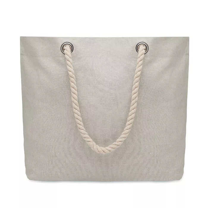 Strand- vagy bevásárlótáska újrahasznosított pamutból, 80% újrahasznosított pamut, 20% hagyományos pamutkötél fülekkel. 220 g/m² vastag anyag.