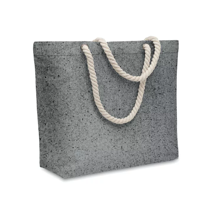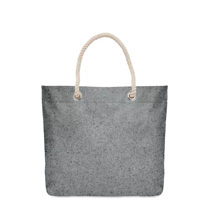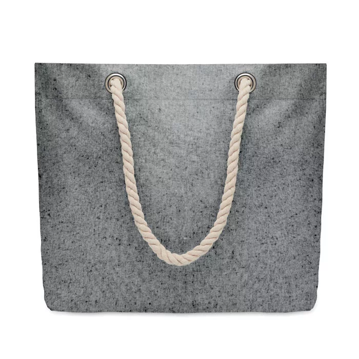 Strand- vagy bevásárlótáska újrahasznosított pamutból, 80% újrahasznosított pamut, 20% hagyományos pamutkötél fülekkel. 220 g/m² vastag anyag.