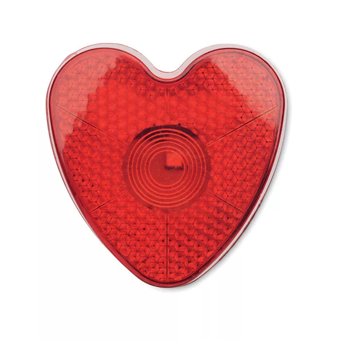 Szív alakú fényvisszaverő piros lámpa ABS-ből, csíptetővel a hátoldalán. Két üzemmód: világítás és villogó. A működéshez szükséges 2 db cserélhető LR44 elemmel szállítjuk.