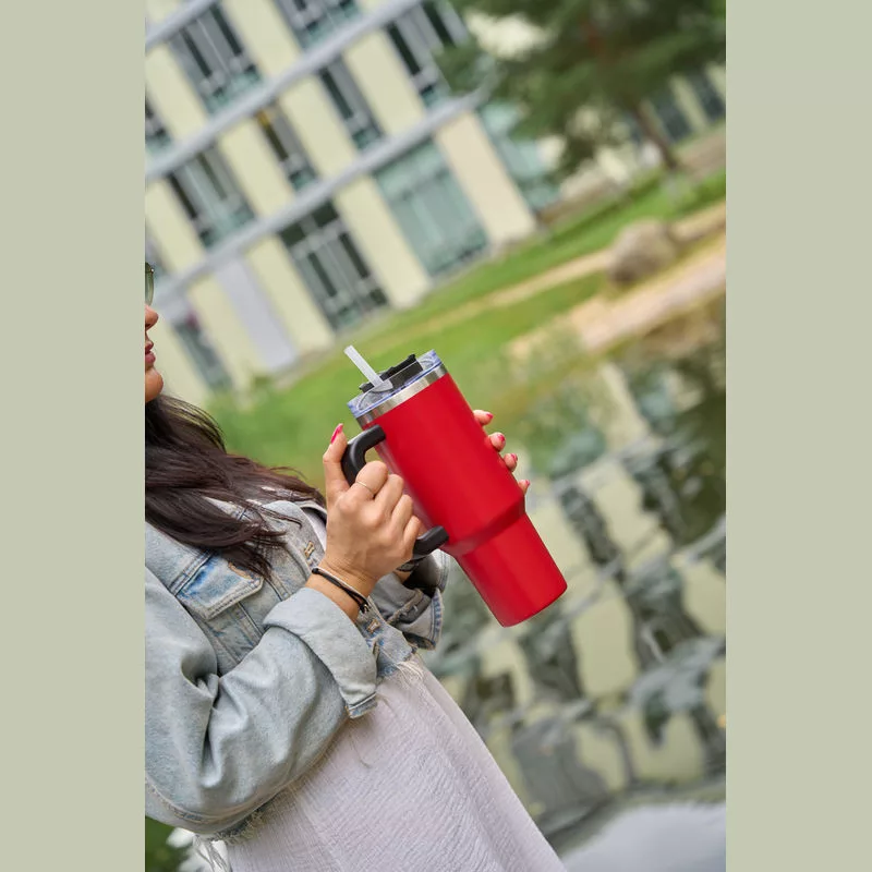1,2 literes BPA-mentes rozsdamentes acélból készült duplafalas vákuumszigetelt termosz, 2 órán át melegen és 4 órán át hidegen tartja az italokat. Újrahasználható szívószállal, ergonomikus markolattal. A kulacs illeszkedik a szokásos italtartókba.