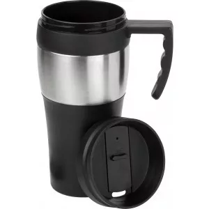 Termoszbögre rozsdamentes acélból és műanyagból. Nem szivárgásmentes. Mosogatógépben nem tisztítható. 500 ml. BPA-mentes műanyag.