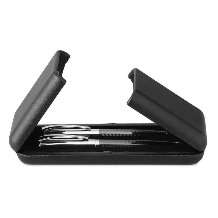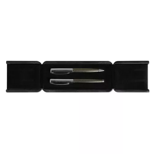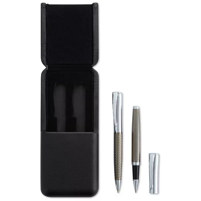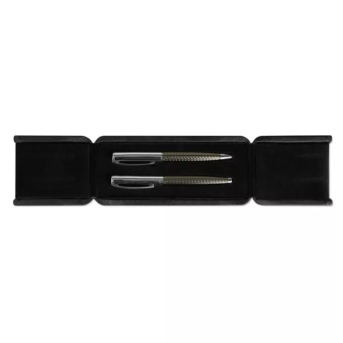 Toll szett ajándékdobozban. Sárgaréz csavarmechanikás golyóstoll és roller toll. Kéken, illetve feketén író betéttel.