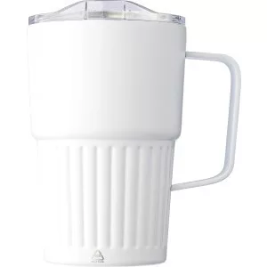 Újrahasznosított rozsdamentes acél útibögre, 450 ml. A belső 304-es, a külső 201-es rozsdamentes acélból készült, bordás markolattal és masszív fogantyúval, műanyag, csúszózáras fedéllel. Gravírozott újrahasznosított logó található a bögrén. Csomagolása barna papírdoboz.