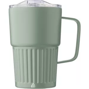 Újrahasznosított rozsdamentes acél útibögre, 450 ml. A belső 304-es, a külső 201-es rozsdamentes acélból készült, bordás markolattal és masszív fogantyúval, műanyag, csúszózáras fedéllel. Gravírozott újrahasznosított logó található a bögrén. Csomagolása barna papírdoboz.