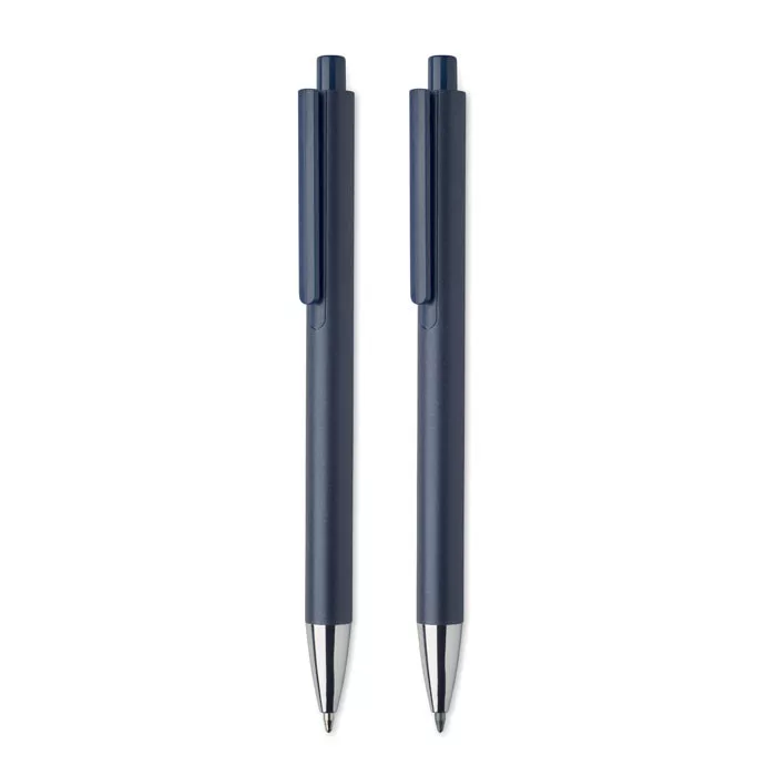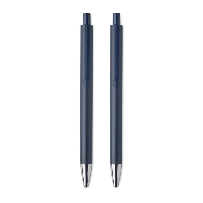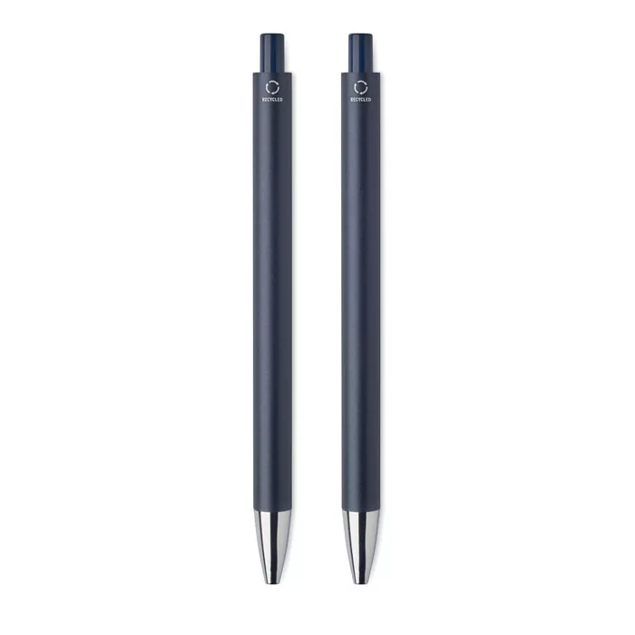 Újrahasznosított alumínium tollkészlet, golyóstollal és grafit, tintamentes tollal. Kéken író betéttel. Újrahasznosított papírdobozban.